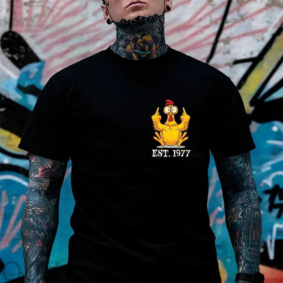 Featuring a loud, eye-catching chicken graphic on the back and a clean mini design on the front, this tee delivers humor, confidence, and zero filters in one look.